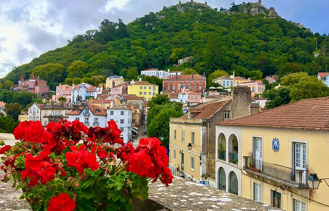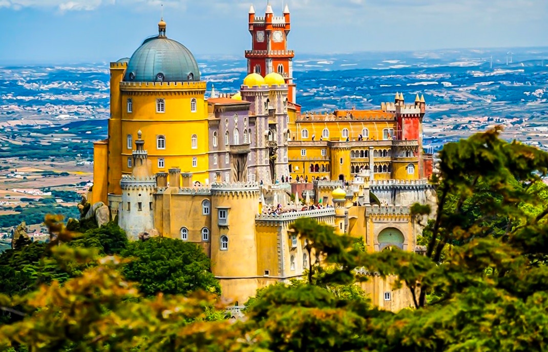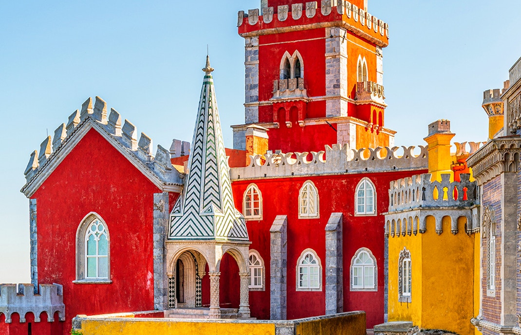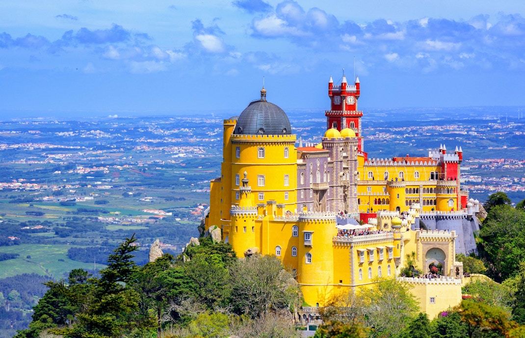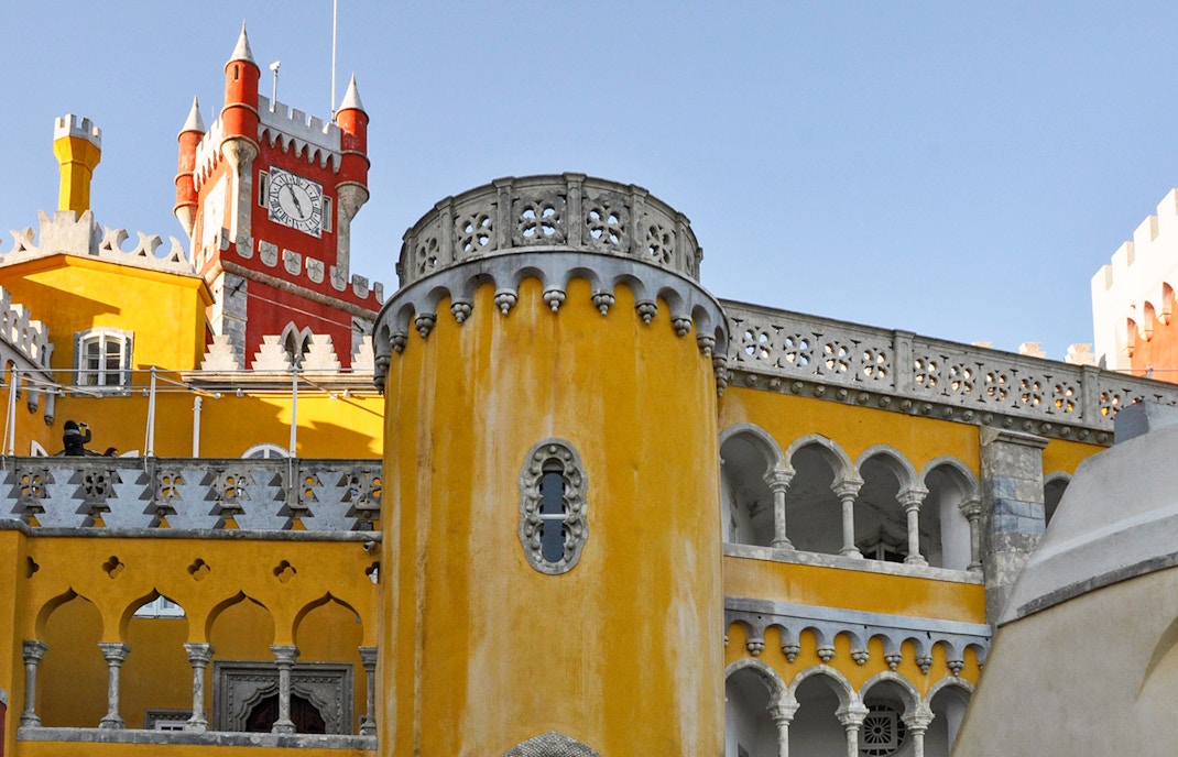 O policromático Palácio da Pena parece uma Fantasyland no topo da Serra de Sintra. Pintado em amarelo brilhante e vermelho carmesim, juntamente com tons de azulejos azuis, um terraço azul intenso e um parapeito de pedra branca clara, é um dos monumentos mais românticos que existem.